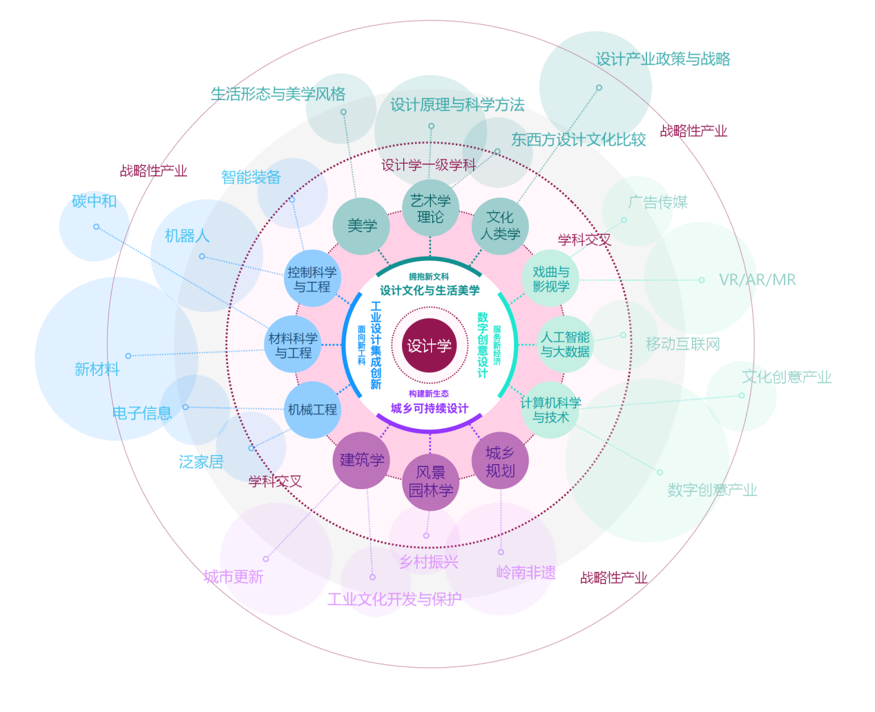 学科方向:围绕服务我省“双十”战略性产业集群和城乡高质量发展,满足广大人民群众对美好生活向往的主线,突破专业拼盘式设置学科方向的束缚,凝练出工业设计集成创新、数字创意设计研究、城乡可持续设计研究、设计文化与生活美学四大学科方向。四大学科方向间的逻辑关系及关联领域如下图所示: