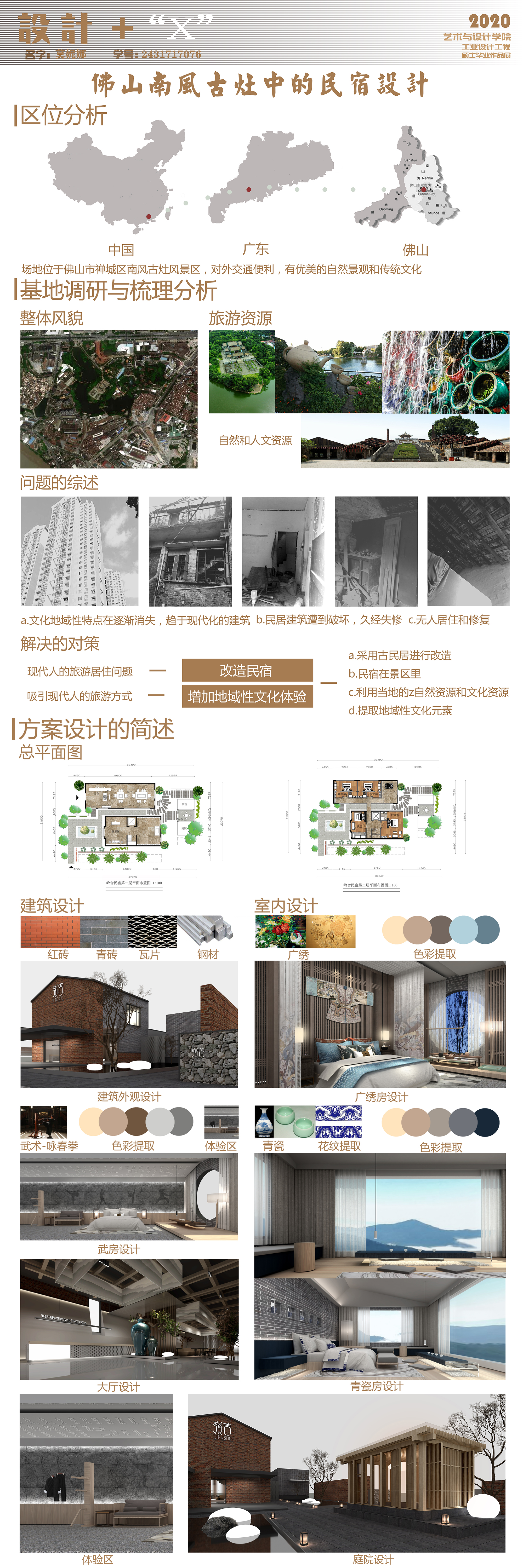 在以文化主导经济的发展下,文化是民宿发展的魂,主要是利用传统文化元素为基础,建立如何应用文化进行空间设计的框架。本设计正是通过对岭南文化元素的提取应用到民宿设计中,并着重探讨岭南文化与现代空间设计相互融合。深入挖掘文化的特点,会以武术文化、陶瓷文化、广绣文化等元素进行主题性设计,最大程度的营造出具有地域性的文化氛围,打造出集体验岭南文化和自然风光为一体的文化主题体验式民宿。